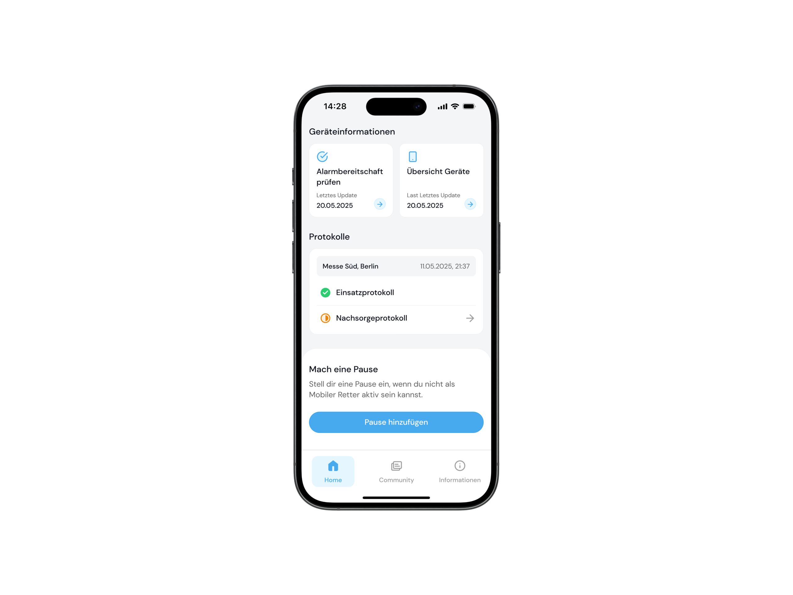 Die App bietet einen Call-Button, über den die Koordinierenden außerhalb der Einsätze einfach erreicht werden können. Der direkte Kontakt und der Community-Bereich mit Informationen zu verschiedenen Anlässen ermöglichen eine effiziente und transparente Kommunikation zwischen Ersthelfenden und Projektverantwortlichen.